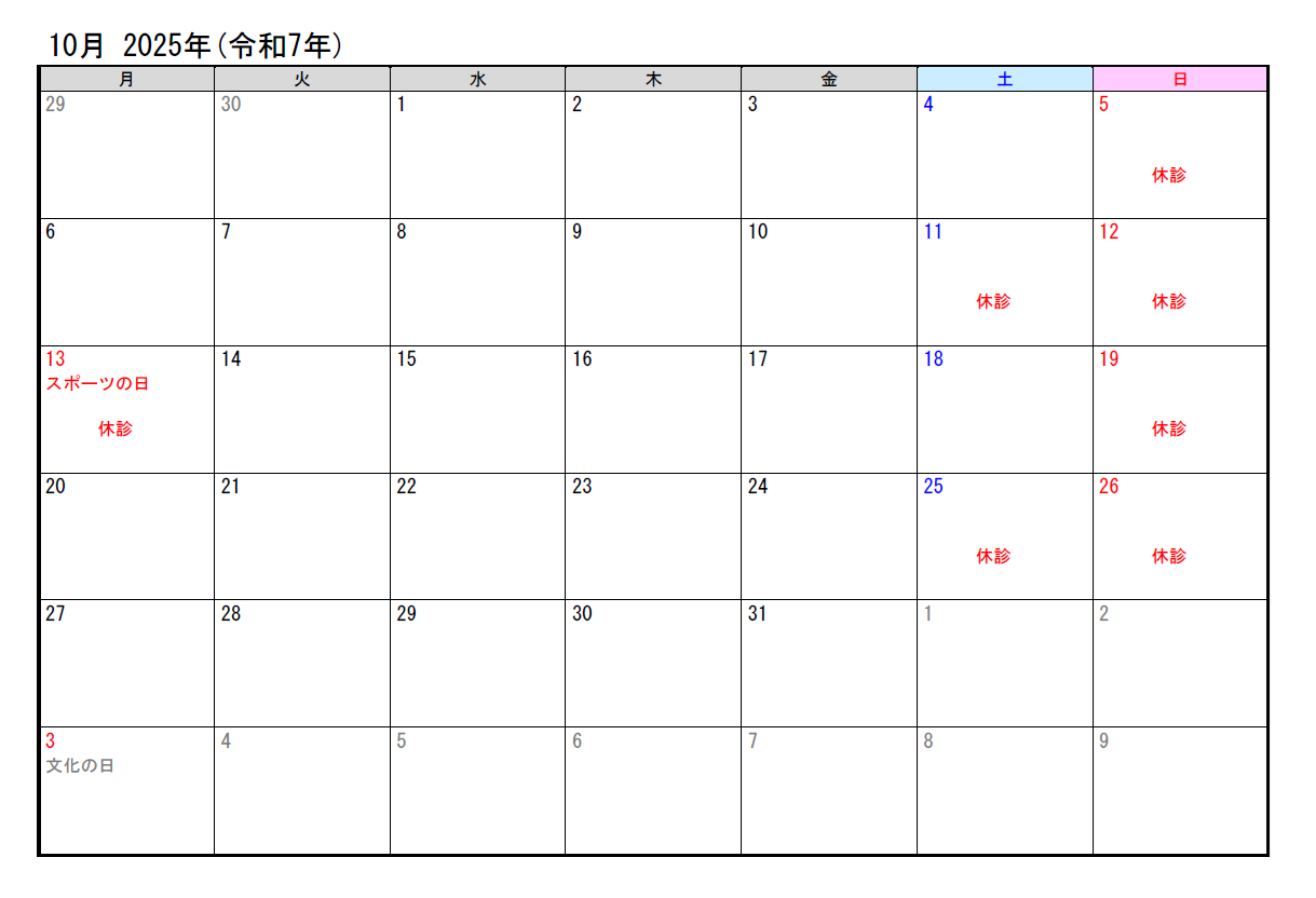 10月の診療予定(休診予定)